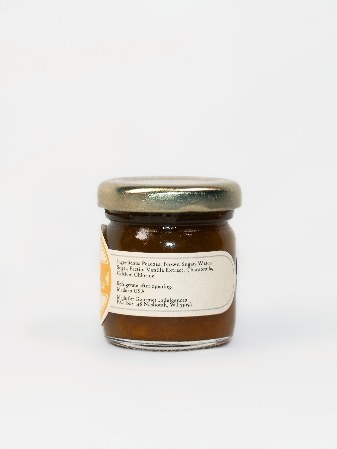 Ingredients: Peaches, Brown Cane Sugar, Chamomile Tea (Water, Chamomile), Cane Sugar, Pectin, Vanilla Extract (Water, Alcohol, Vanilla Bean Extractives)