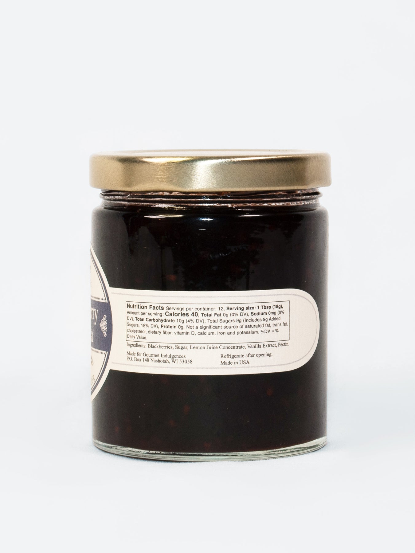 Ingredients: Blackberries, Sugar, Lemon Juice Concentrate, Vanilla Extract, Pectin