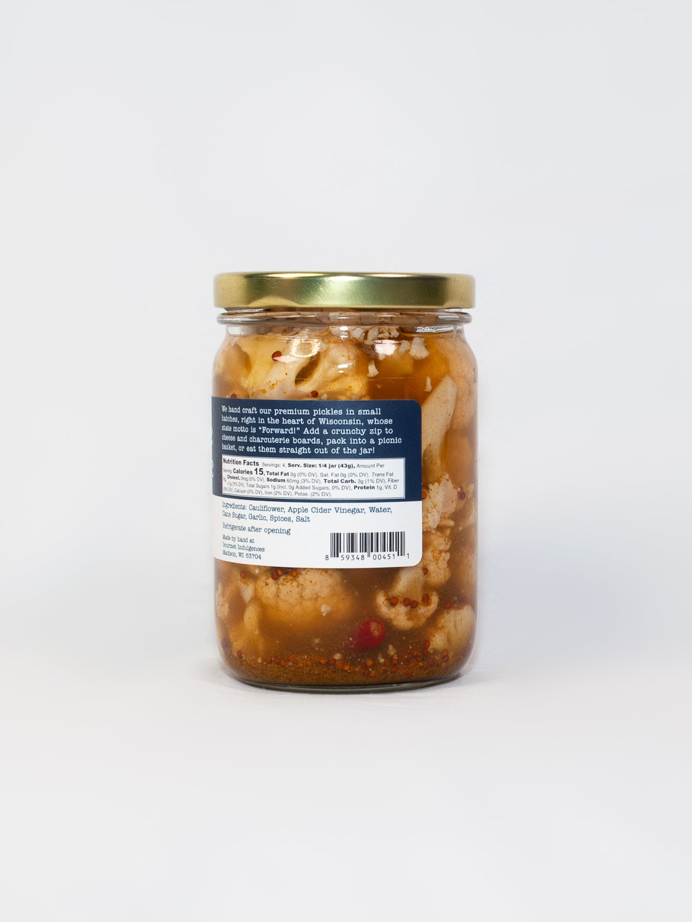 Ingredients: Cauliflower, Apple Cider Vinegar, Water, Sugar, Garlic, Spices, Salt